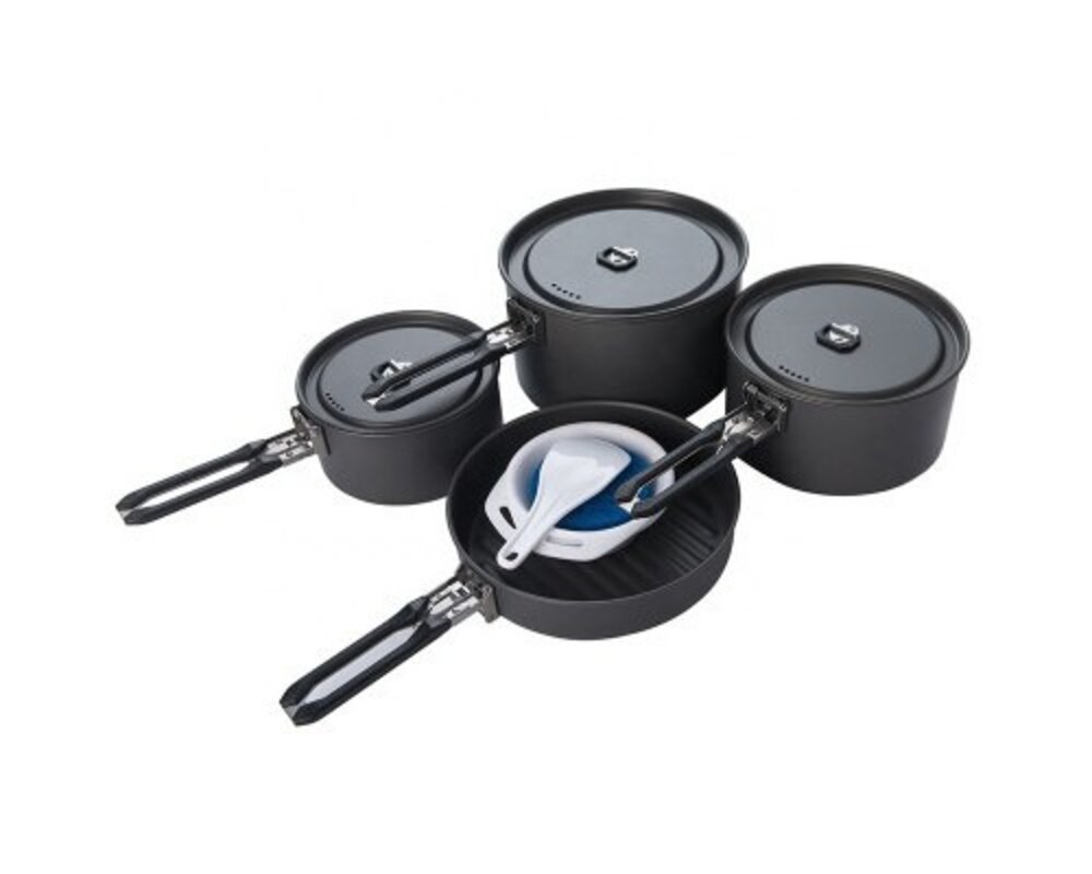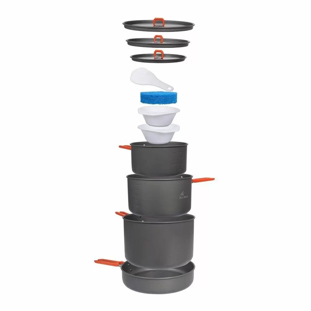 Набор посуды Fire Maple Feast 5 рассчитан на приготовление пищи для 4-5 человек. В набор входят три кастрюли с крышками, объемом 2,7, 1,7 и 1 литр соответственно, сковорода объемом 1 литр, две пластиковые тарелки, лопатка и губка для мытья посуды. Складные ручки с термоизолирующим покрытием. В комплекте сетчатый чехол для удобства хранения и транспортировки.