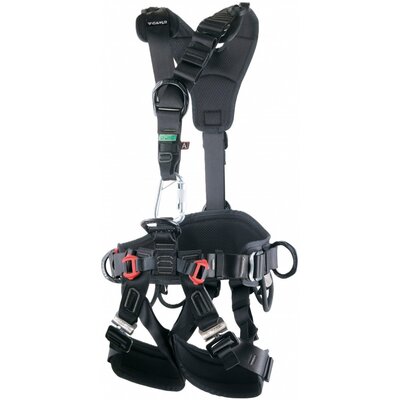 - 6 точек крепления из алюминиевого сплава: 1 грудная и 1 на спине с сертифицированными индикаторами нагрузки для крепления страховочных устройств, 1 брюшная для подвешивания, 2 боковые для позиционирования и фиксации, 1 спинная для позиционирования