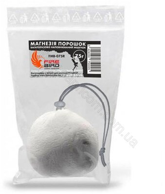 Магнезія в кульці FMB-075R фірми FireBird. Форма кулі дозволяє обробляти всю долоню, знижує витрату магнезії, зменшує кількість пилу. Мішечок на шнурку з фіксатором призначений для багаторазового використання.