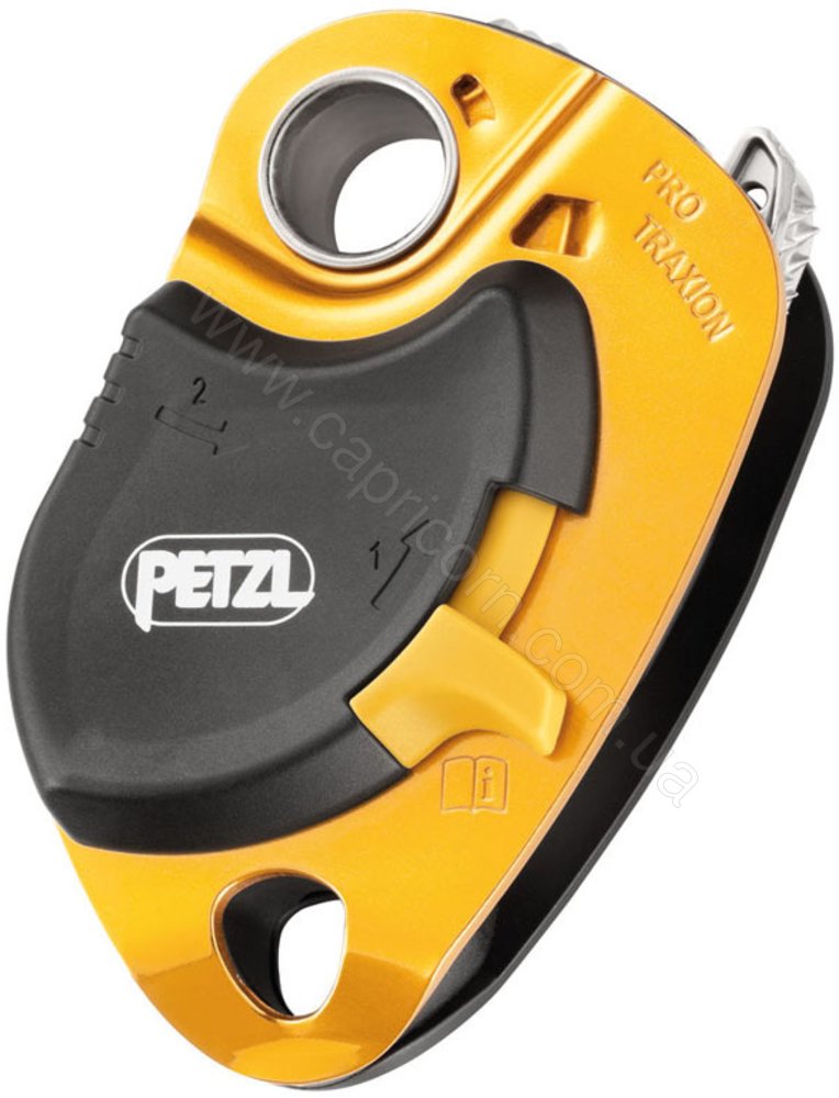 Високоефективний блок-зажим Petzl Pro Traxion. Пристрій для підйому важких вантажів. Ідеальний для роботи на великих стінах. Виняткова ефективність забезпечується роликом діаметром 38 мм на шарикопідшипнику. Одна фіксована щока, інша поворотна - це дозволяє заправити мотузку, навіть якщо Pro Traxion вже прикріплений до точки закріплення. Оновлений дизайн защіпки дозволяє відкривати пристрій однією рукою.