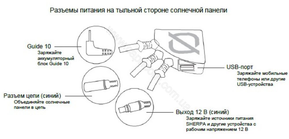 - вихідний Solar Port (синій, 8 мм): 14-22 В, регульований ток до 0,9 A (13 Вт) - для зарядки джерел живлення типу Goal Zero Sherpa або інших пристроїв з робочою напругою 12 В