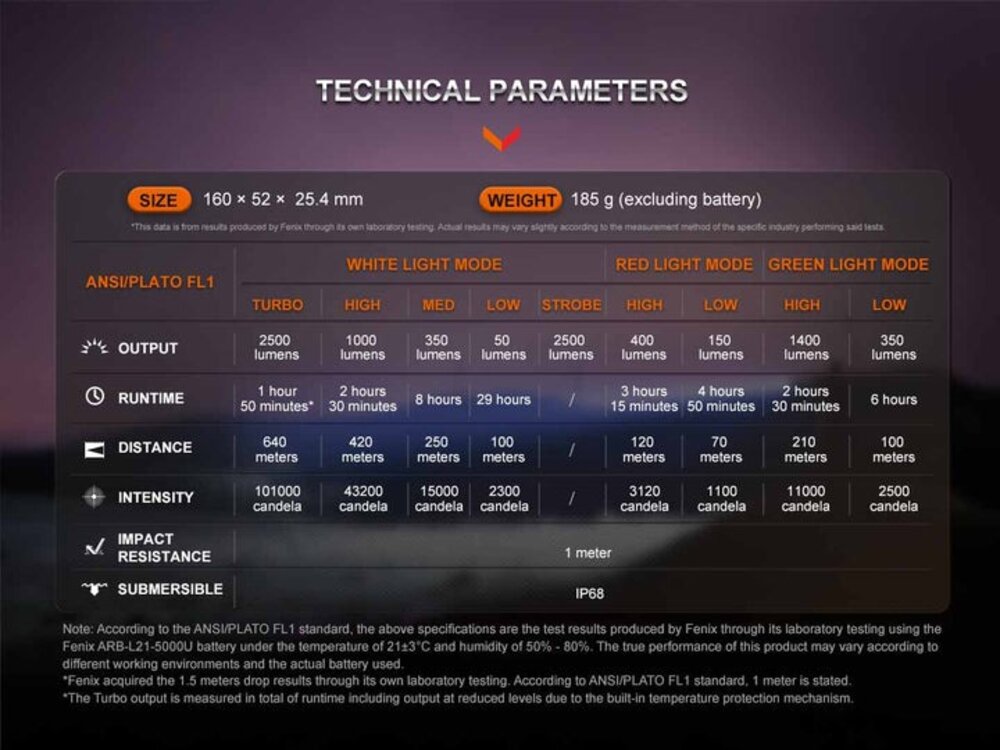 - ліхтар можна кріпити на зброю за допомогою кріплень Fenix ALG-00, Fenix ALG-06, Fenix ALG-16 або Fenix ALG-18; керувати світлом можна за допомогою виносної кнопки Fenix AER-05. Усі аксесуари продаються окремо