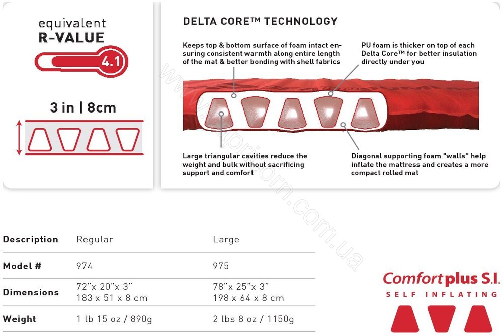 - технологія Delta Core™ знижує вагу килимка на 40% без зниження теплоізоляційних властивостей і зручності в користуванні шляхом зміни щільності піни в різних частинах килимка і трапецієподібних вирізів