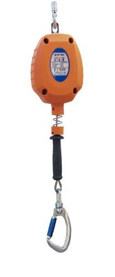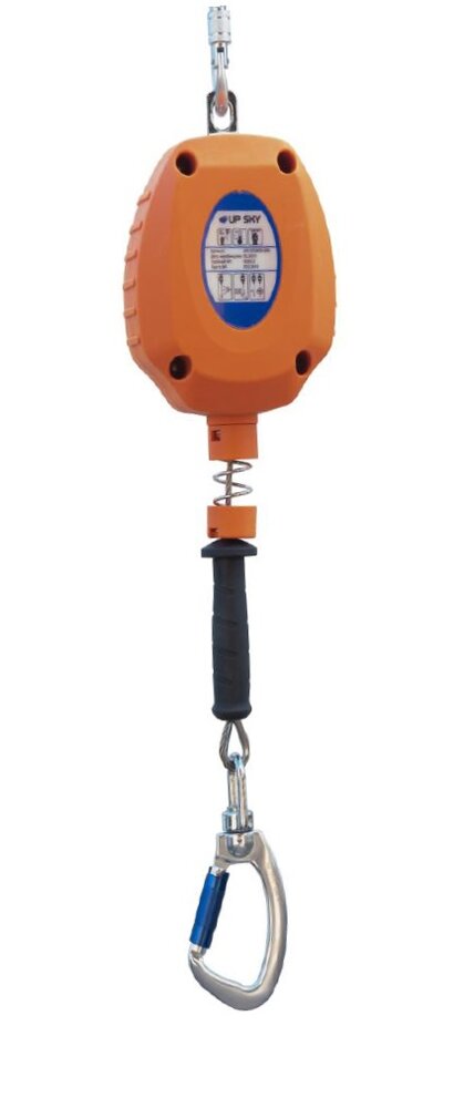 Принцип роботи: пристрій автоматично видає та втягує страхувальний трос, запобігаючи його провисанню. При різкому падінні спрацьовує гальмівний механізм, який миттєво зупиняє падіння.