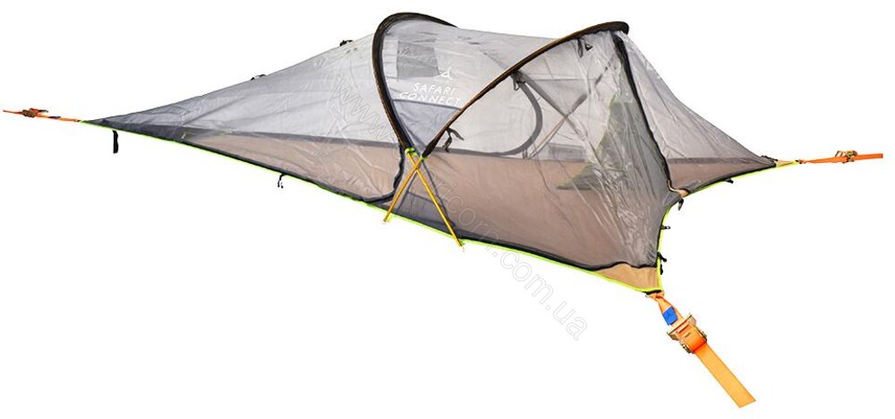 SAFARI CONNECT 2-PERSON TREE TENT - абсолютно новий напрямок в "наметобудуванні" - підвісна конструкція, яка поєднує кращі властивості гамака і звичайного намету. Має два шари - тент і внутрішній намет, які за принципом будови схожі зі звичайним наметом, але розтягуються між деревами або іншими опорами як гамак, оберігаючи жителів від нерівної, похилої або кам'янистої поверхні, вологого ґрунту і дрібної живності, яка прагне залізти всередину. Матеріал такого намету стійкий до впливу ультрафіолету, посилений стропами для рівномірного розподілу навантаження і має відмінну механічну міцність. Намет розрахований на комфортний відпочинок і сон для двох осіб.