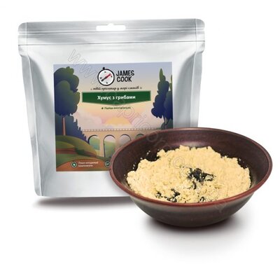 Хумус з грибами - вегетаріанська страва швидкого приготування для використання в походах, подорожах, виїздах на природу, кемпінгах або відрядженнях. Пакет містить одну порцію сухого продукту для дорослої людини. Упаковка з застібкою zip-lock може бути використана як миска.