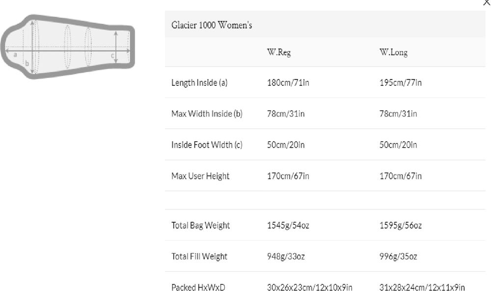 Специфікації спального мішка-кокона Mountain Equipment GLACIER 1000 WOMEN'S Regular LZ: