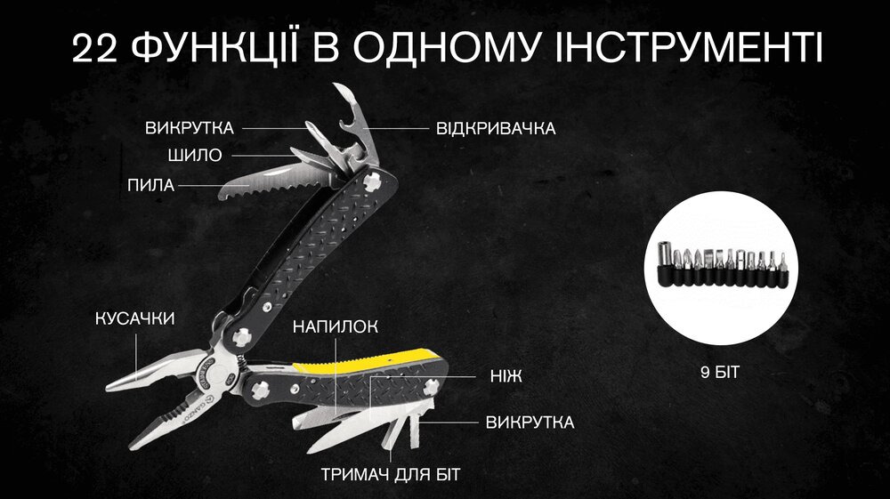 G106 - повнорозмірний мультитул.12 найбільш уживаних функцій і набір біт - корисний інструмент як у побуті, і при виїздах на природу. Ергономічні ручки, інструменти з нержавіючої сталі. Чохол у комплекті.