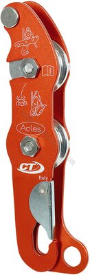Спусковий пристрій Acles DX фірми Climbing Technology для довгих спусків по мотузці в вузьких місцях з контролем за швидкістю спуску. Може бути встановлений на мотузку без від'єднання від обв'язки завдяки пружинній кліпсі. Контроль за швидкістю спуску здійснюється натягом вільного кінця мотузки. Можливий підйом по мотузці без зміни положення пристрою, при використанні петлі під ногу і жумара. Замінювані кулачок і бобіна. Для одинарних мотузок діаметром від 9 до 12 мм.