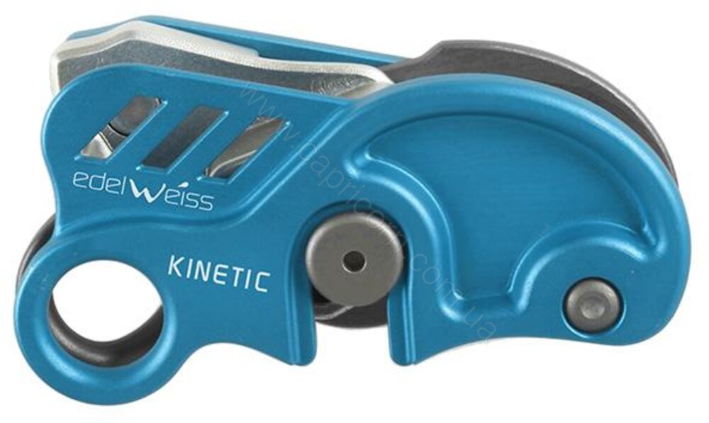 KINETIC - компактний страхувально-спусковий пристрій для альпінізму і скелелазіння для роботи з одинарною мотузкою діаметром 8,5-10,5 мм. Принцип роботи пристрою схожий з пристроями типу стакан. Складна ручка дає можливість регулювати силу тертя мотузки під час спуску.