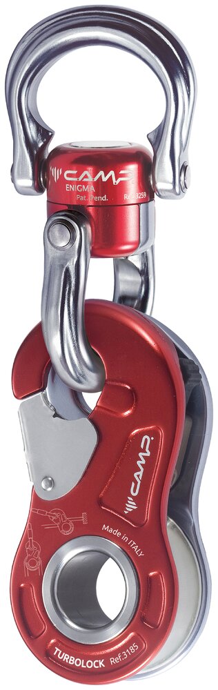 Enigma – роз'ємний вертлюг з великими скобами. Обидві ланки пристрою обертаються на кульковій вальниці та можуть бути відкриті. Перешкоджає скручування мотузок під час проведення робіт, пов'язаних з підйомом та переміщенням вантажів. Дозволяє економити місце та спорядження, вв'язуючи петлі та стропи безпосередньо у вертлюг, без карабінів.